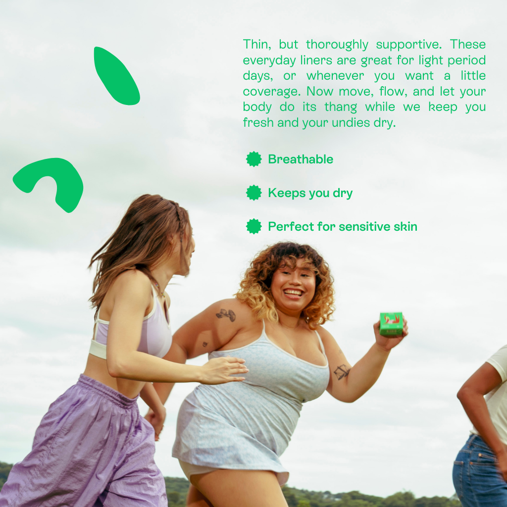 Thin, but thoroughly supportive. These liners are great for light period days, or whenever you want a little coverage. Now move, flow, and let your body do its thang while we keep you fresh and your undies dry.